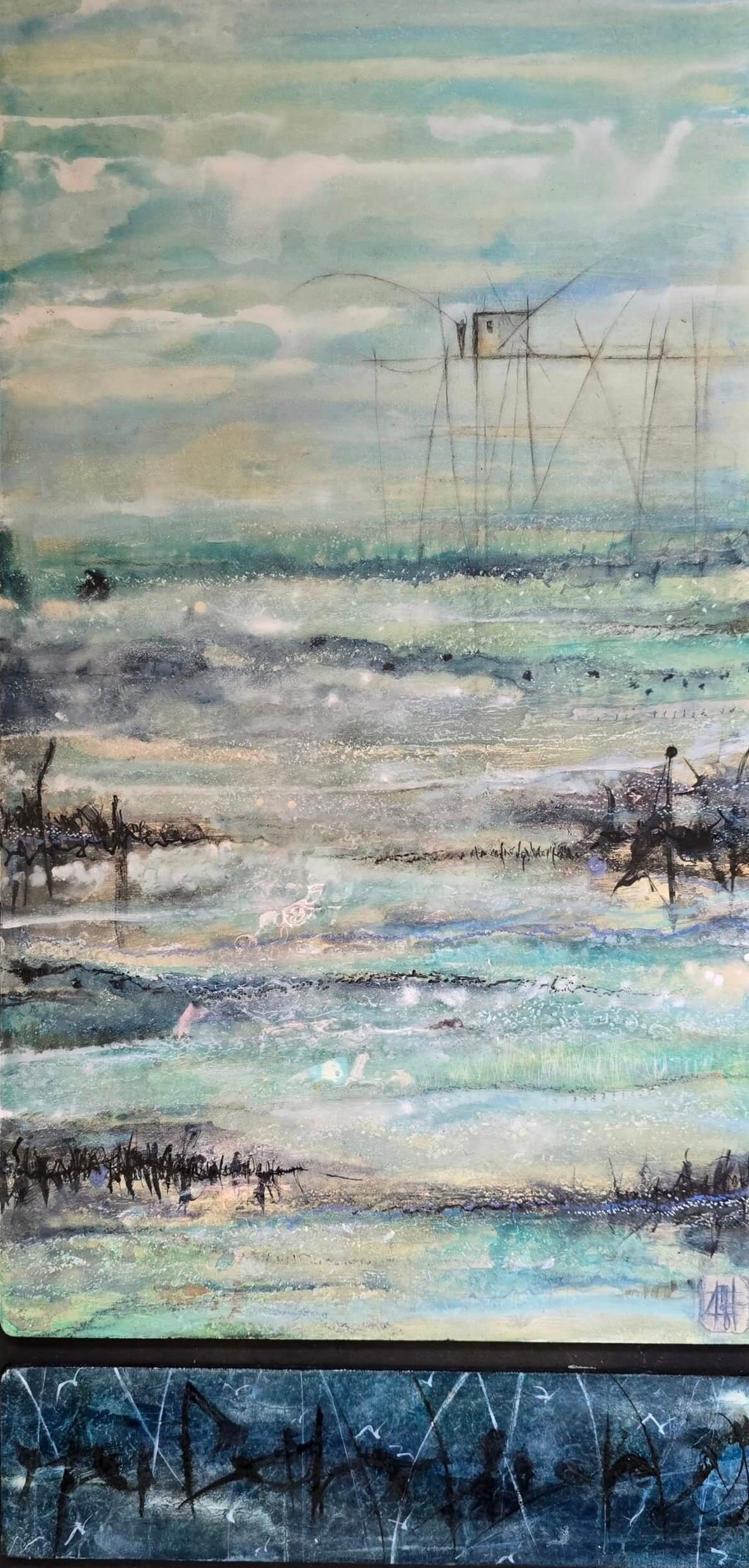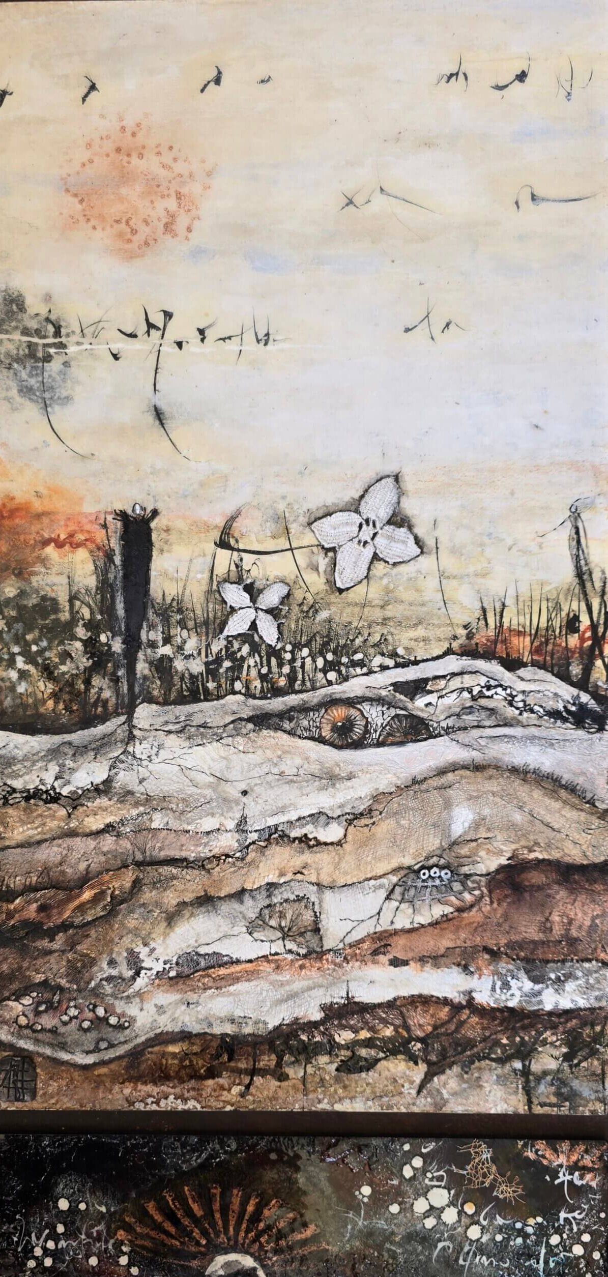 Un papier brûlé, calligraphié, mémoire de l’onde, émerge entre les grains, grains de beauté illuminés.